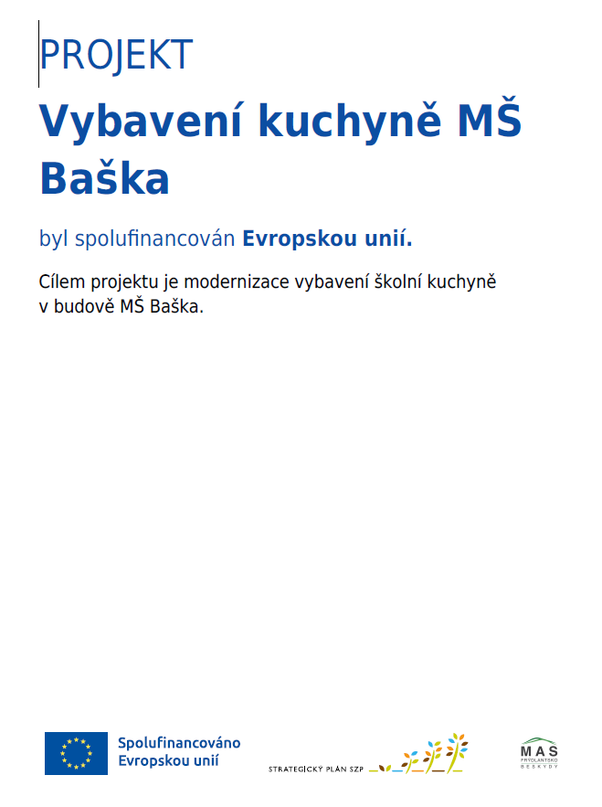Cílem projektu je modernizace vybavení školní kuchyně v budově MŠ Baška.