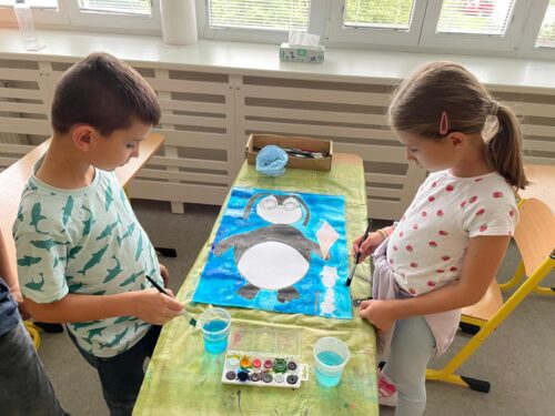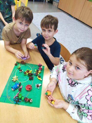 Děti se zapojily do různorodých výtvarných projektů – kreslení, malování, tvoření z plastelíny nebo vyrábění s přírodními materiály (listoví broučci, kamenní pavoučci). Vyzkoušely si i vaření a pečení – připravili jsme pizzu, pudink a kakao. Pokusili jsme se o jedlé umění za použití ovoce a zeleniny. Ochutnávání bylo tou nejlepší odměnou!