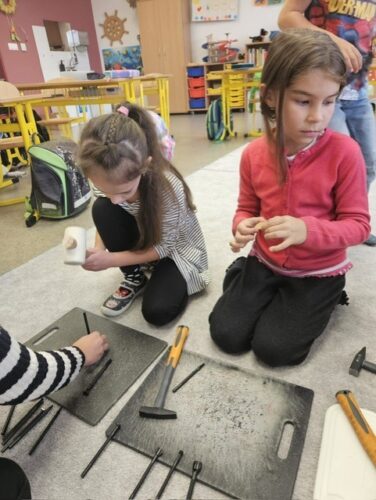 Jedno z oddělení zažilo projektový den s kůží, kde si děti zkusily práci s pravou hovězí kůží, vyrábění šperků, malbu a dokonce i šití na šicím stroji. Polytechnická výchova probíhá nejen při výuce, ale i ve školní družině, kde děti pracovaly s aku vrtačkou, kartonem i dřevem – např. při výrobě koňských hlav.