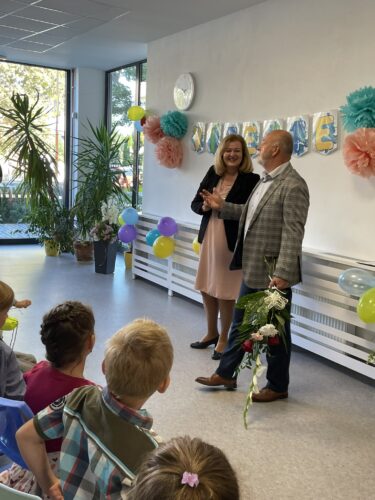 Paní ředitelka společně s učitelkami s úsměvem přivítaly všechny nové školáky na slavnostním zahájení ve vyzdobené školní jídelně. Všem popřála úspěšný a radostný rok plný objevů, kamarádství a nových zkušeností.