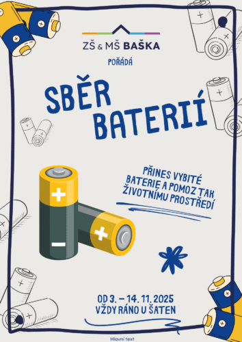Vybité baterie budou vybírat ve vestibulu školy členové školního parlamentu, a to od 3. do 14. listopadu 2025 vždy ráno před vyučováním od 7:10 do 7:50 hod. Můžete odevzdávat běžné baterie používané v domácnosti (tužkové, knoflíkové, ploché baterie). Nenoste baterie vyteklé, lithiové baterie ani autobaterie! Na žáky, kteří v průběhu podzimního a jarního sběru přinesou nejvíce baterií čeká odměna.
